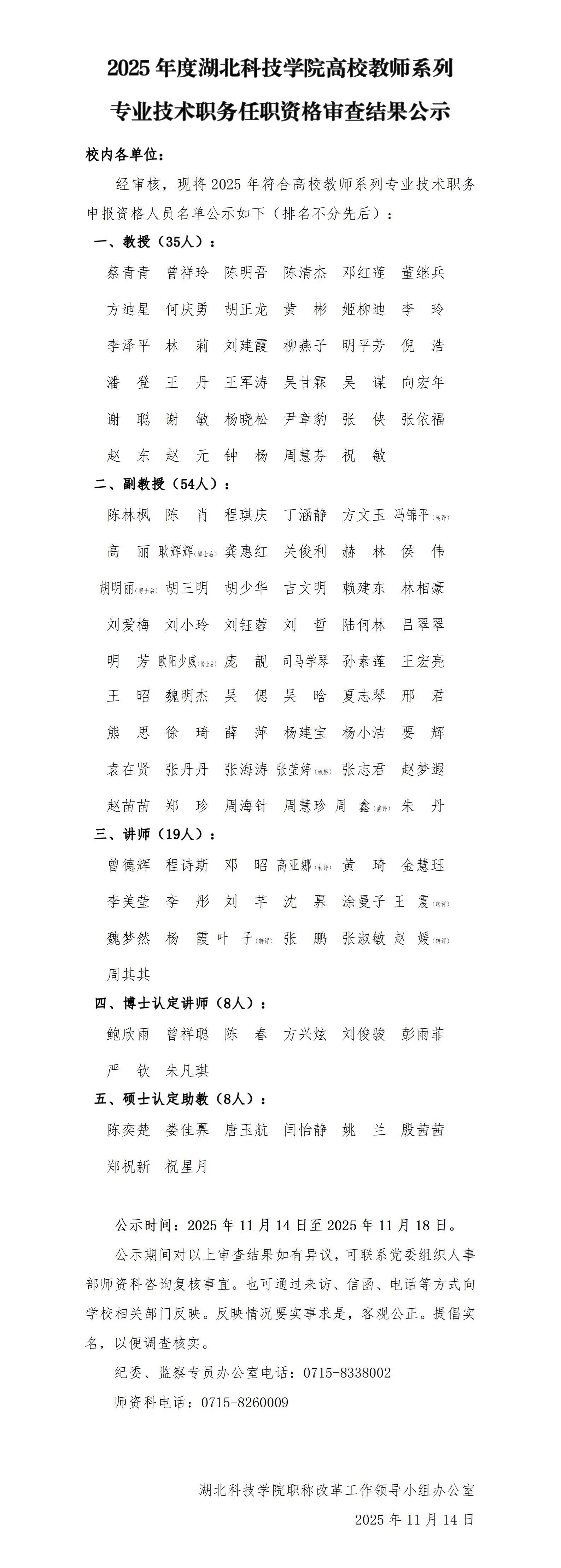 2025年度湖北科技学院高校教师系列专业技术职务任职资格审查结果公示