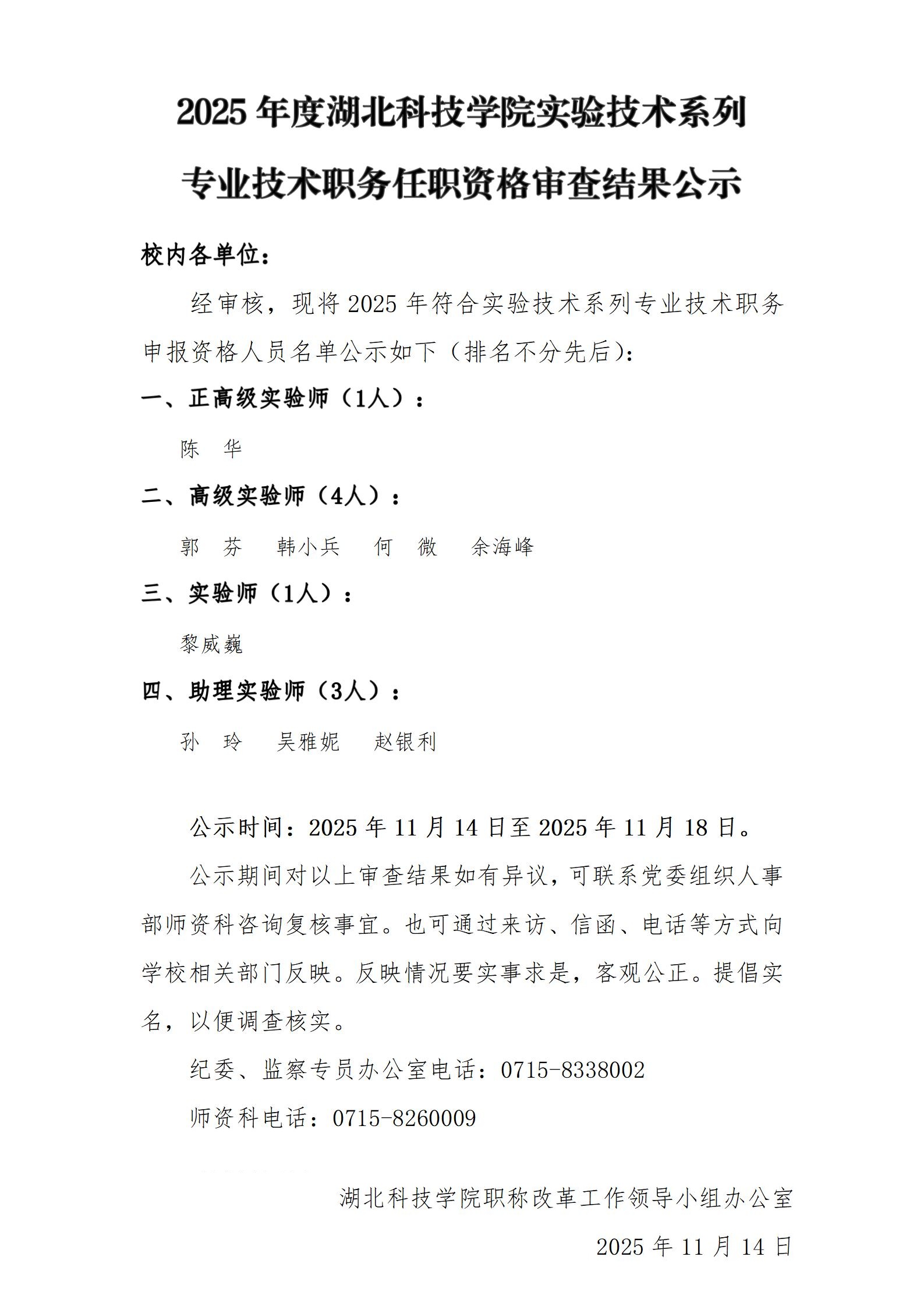 2025年度湖北科技学院实验技术系列专业技术职务任职资格审查结果公示